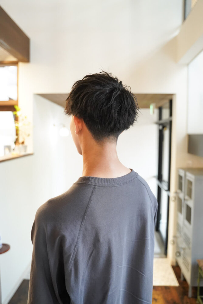 刈り上げ短めで束感が出やすいようにチョップカットでギザギザになるようにしてるのでスタイリングも簡単に出来ますよ! スタイリング剤はエトラスのムーブセラム。